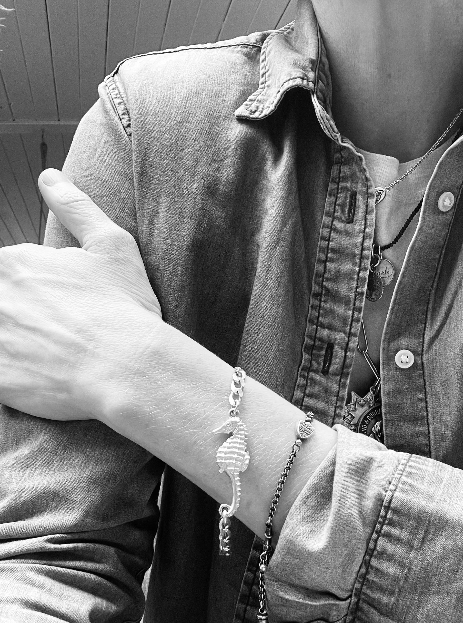 The seahorse measures 5cm tall from end to end. The bracelet is made from a vintage cuban link chain and finished with handmade jump rings and a dog clip.